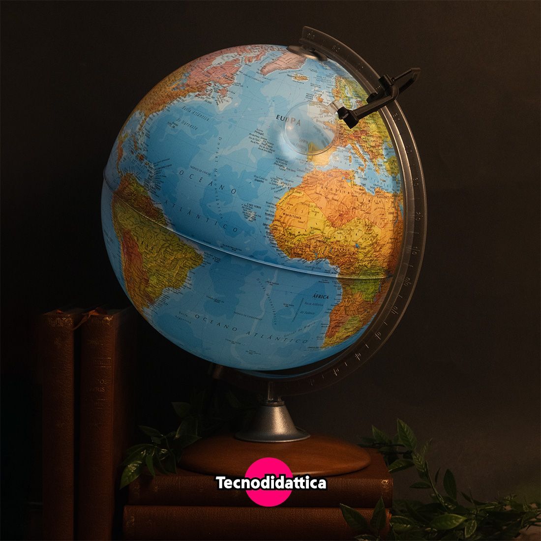 - Globo de 30/40 cm com dupla cartografia física e política: permite comparar rapidamente aspetos naturais e divisões humanas do planeta com uma simples mudança de iluminação;