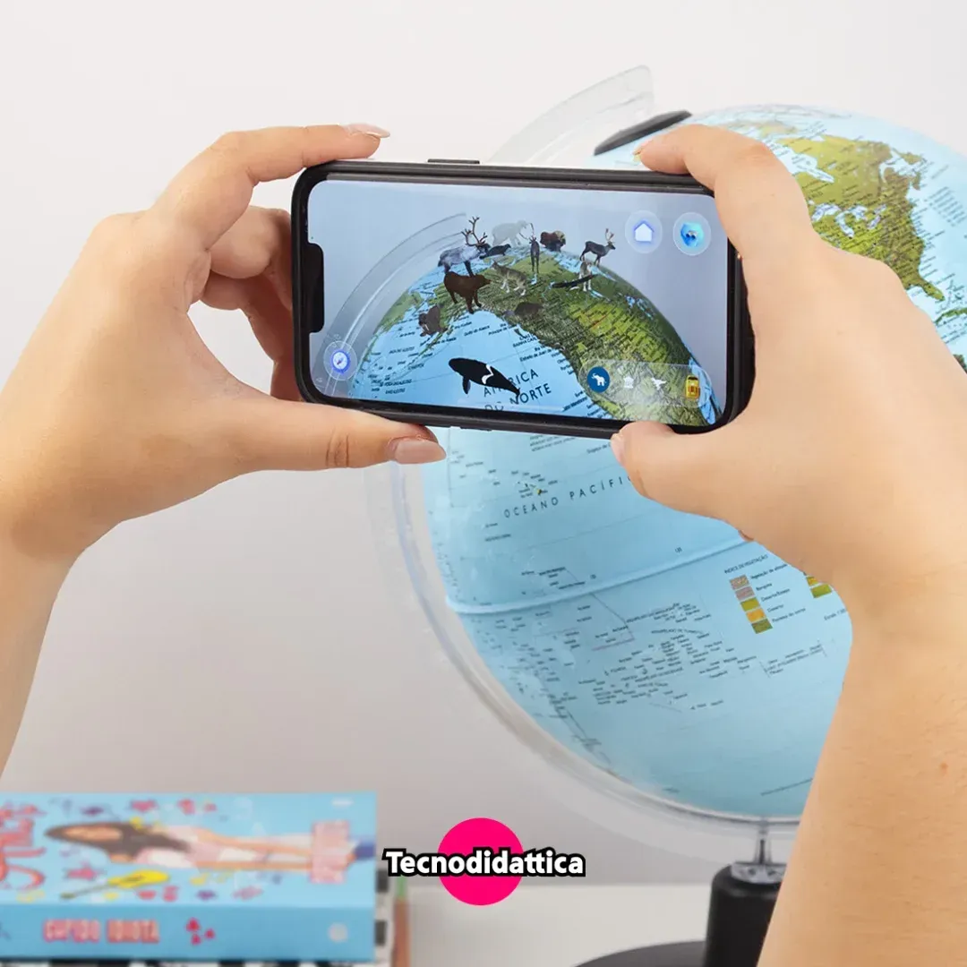 Globo terrestre interativo Gaia com luz de baixa voltagem, enriquecido com conteúdos de Realidade Aumentada (animais e monumentos).