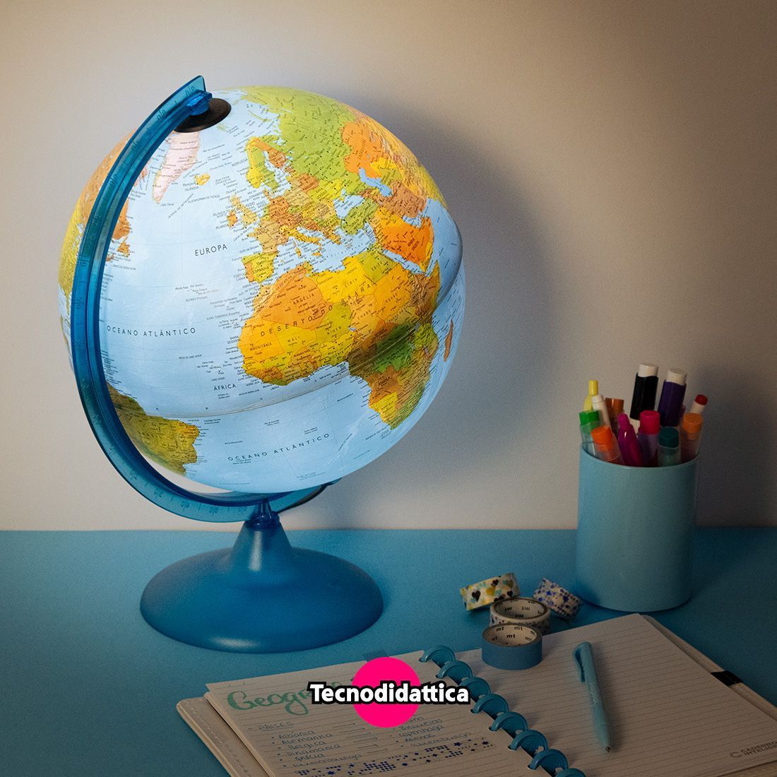 - Globo de 25/30cm com cartografia dupla: mostra o mapa físico com a luz desligada e revela o mapa político quando iluminado, proporcionando duas visões complementares do mundo;
